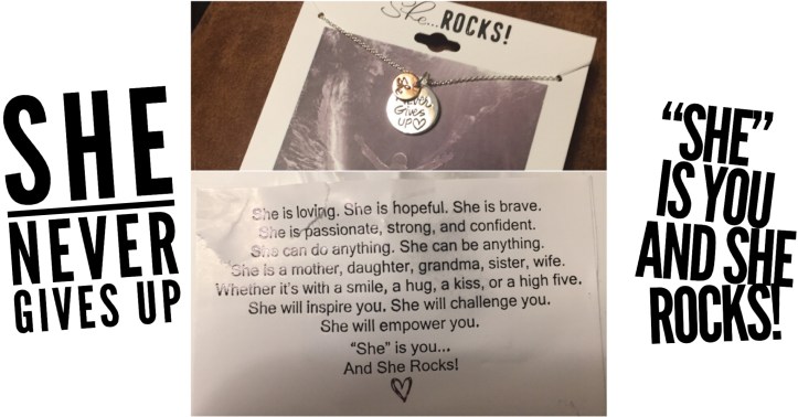 I went to the store to pick up a prescription and decided to look around a little. I was looking at all the different jewelry and found some on clearance called “She Rocks.” I found a lot of ones I liked but this one really spoke to me. I’ve gone through depression and mental health issues, I tried to give up, but I couldn’t. I’ve been through various traumas and I’ve chosen to never give up.