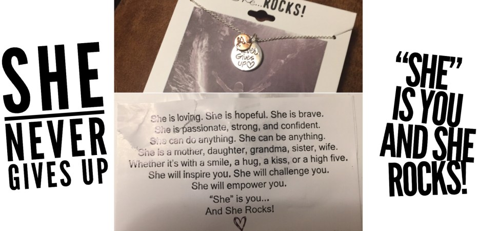 I’ve seen different online ads for this company where you can hand pick a word for yourself. With this necklace I picked up today, I chose the phrase “she never gives up.”
